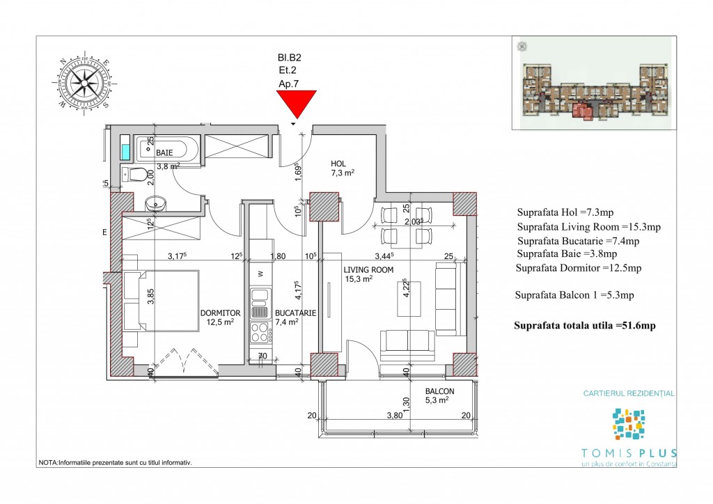 Imobilul desfasurat pe S+P+9E se distinge fata de celelalte imobile noi construite in cartierul Tomis Plus prin arhitectura moderna, calitatea executiei si a materialelor folosite – respectand toate standardele in materie de constructii – fara rabat de la calitatea si cantitatea de materiale folosite.