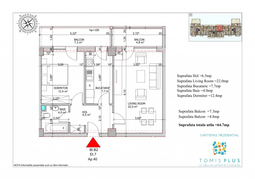 Imobilul desfasurat pe S+P+9E se distinge fata de celelalte imobile noi construite in cartierul Tomis Plus prin arhitectura moderna, calitatea executiei si a materialelor folosite – respectand toate standardele in materie de constructii – fara rabat de la calitatea si cantitatea de materiale folosite.